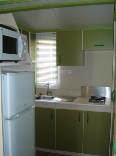 2 chambres séparées (lit de 140x200 cm et 2 lits de 80x200 cm + un bz) + 4 couettes, Les draps et les taies d’oreiller ne sont pas fournis, coin séjour avec table et 6 chaises, BZ, télévision satellite. Coin cuisine, évier, frigo-congélateur, table de cuisson, four micro-onde, cafetière électrique, vaisselle et ustensiles de cuisine. Salle d'eau, lavabo, douche, wc séparé. Grande terrasse semi-couverte avec salon de jardin.